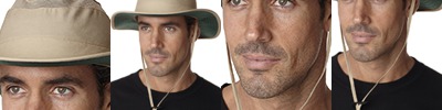 70% cotton, 30% polyester; UPF 45+ protection; Stain-resistant coating; Wide brim; Mesh ventilation insert in crown; Green under visor reduces glare; Adjustable chin strap with pull-up fabric chin lock; Interior self-adhesive closure pocket4”w x 2”h imprint area;