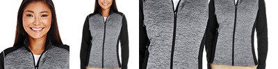 body: 6.49 oz./yd2 / 220 gsm, 100% polyester mélange jersey bonded with fleece; contrast: 6.49 oz./yd2 / 220 gsm, 100% polyester jersey bonded with fleece; Center front coil zipper with semi autolock slider ; Front and back princess seam for flattering feminine fit; Lower pockets with hidden snap closure; Tonal coverstitch details on armholes and shoulder seams;