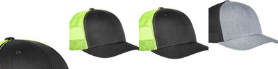 74% polyester, 26% cotton; Style is transitioning from 65% polyester/35% cotton; Mixed fabric inventory may occur; 5-panel, structured, high-profile; Eight-row stitching on flat visor; 4" crown; Hard buckram backed front panels; Matching undervisor; Plastic adjustable closure;
