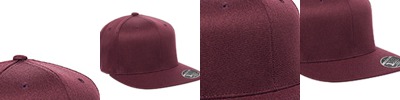 83% acrylic/15% wool/2% spandex • patented 110 design for the ultimate one size fits all cap • hard buckram backing • structured • high-profile • 6-panel • flat visor • plastic strap closure • 3 3/4" crown height • 4"w x 2"h imprint area • Sizes: one size