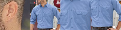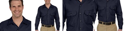 65% polyester, 35% cotton; Visa® moisture-wicking and stain-release finish; Generous fit across shoulders; Long-sleeves, extra-long tail and 20-line melamine buttons; Two chest pockets and two-button cuffs for a custom fit; Dickies logo patch at bottom of placket; Shirt colors match Dickies traditional work pants;